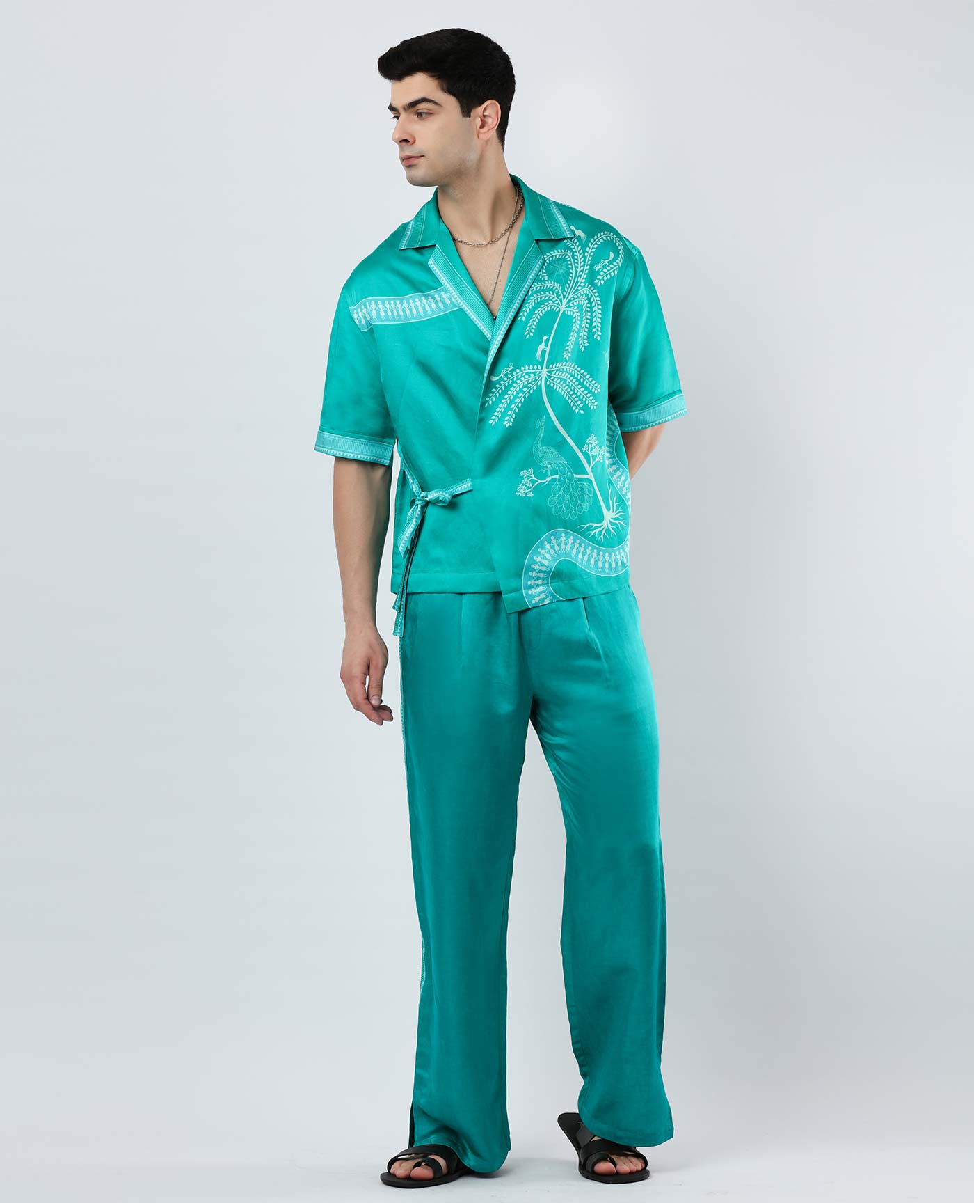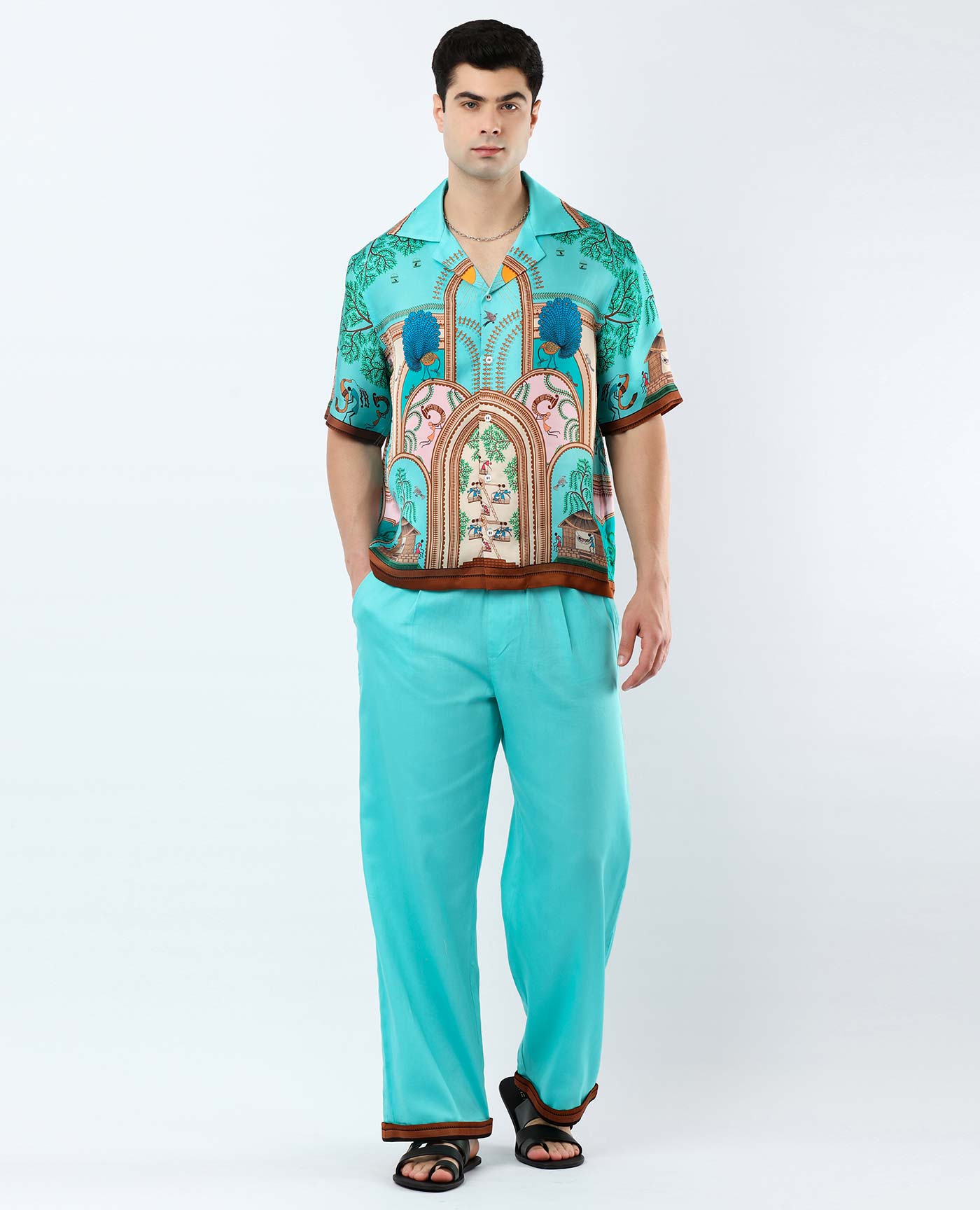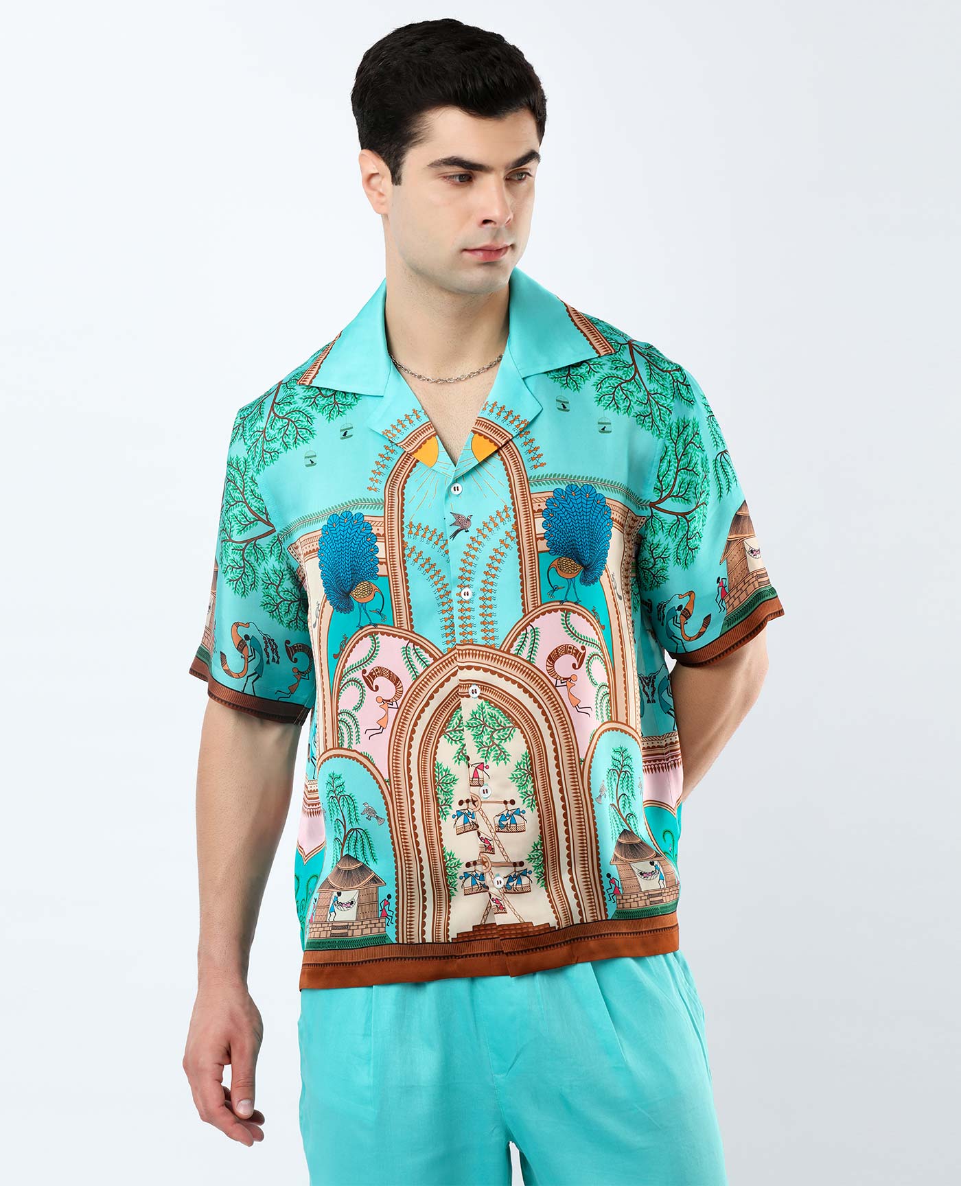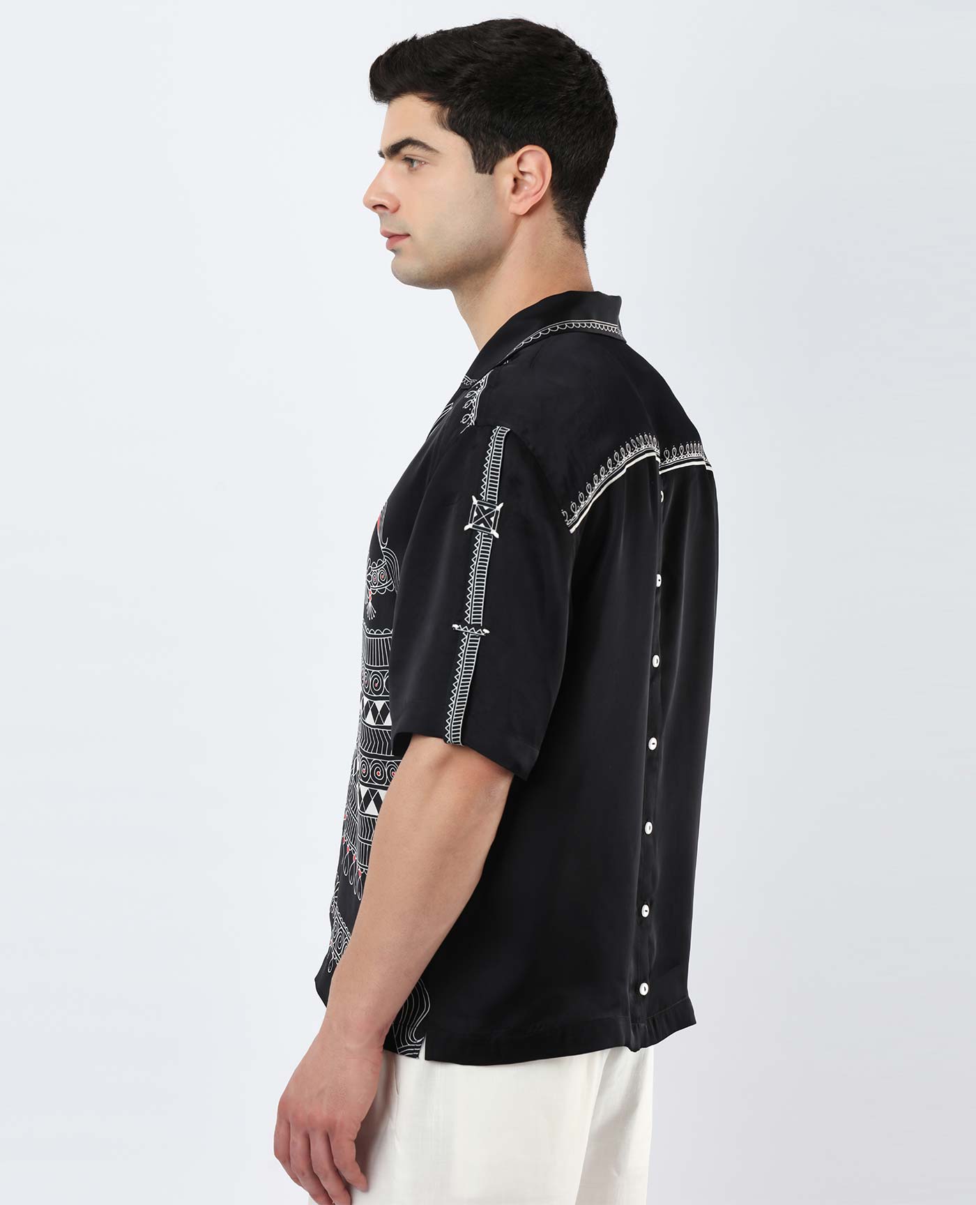 A statement full-sleeve tee in a navy base, featuring a striking engineered print inspired by the miniature art of Kangra. Finished with a sleek back zip, this versatile piece transitions effortlessly from day to night with a refined artistic flair.